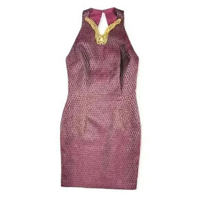 Description: Sheath dress at midi length; sleeveless; lined; back zipper with button closure; keyhole back; gold-colored chain embellishment at neckline with attaached broach; light metallic sheen throughout piece; textured quilted style.