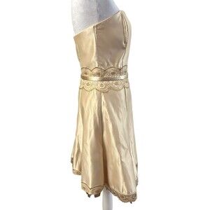 The Jessica McClintock Gunne Sax Satin Strapless Dress is a vintage piece that exudes elegance and sophistication. Made from luxurious polyester satin in a beautiful gold color, this knee-length dress features delicate lace and ribbon accents for a touch of added glamour. The fit & flare style and strapless design make it perfect for formal occasions or parties, with a vintage vibe that adds a timeless charm to any event. With a size 7 and a zip closure, this dress is a must-have for any fashion-forward woman looking to make a statement at her next special occasion.