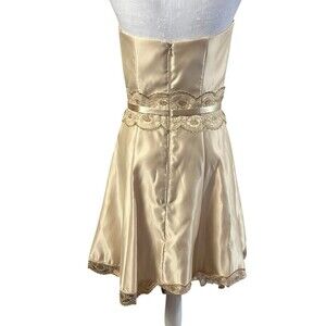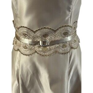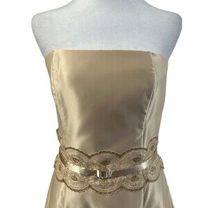 The Jessica McClintock Gunne Sax Satin Strapless Dress is a vintage piece that exudes elegance and sophistication. Made from luxurious polyester satin in a beautiful gold color, this knee-length dress features delicate lace and ribbon accents for a touch of added glamour. The fit & flare style and strapless design make it perfect for formal occasions or parties, with a vintage vibe that adds a timeless charm to any event. With a size 7 and a zip closure, this dress is a must-have for any fashion-forward woman looking to make a statement at her next special occasion.