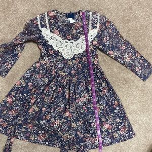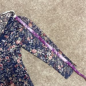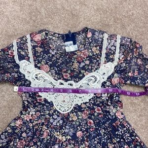 Vguc pfsf navy blue with maroon pink blue gold flowers pretty lace collar very 80’s has to ties that go to the back and zips down size 5