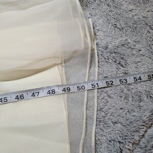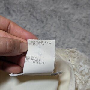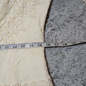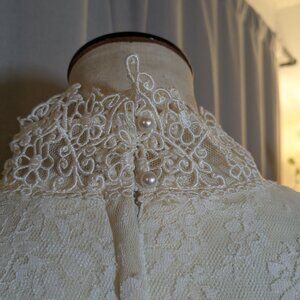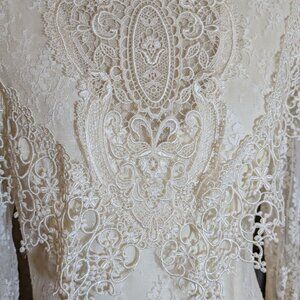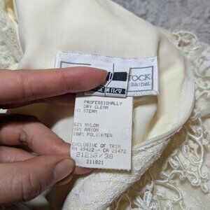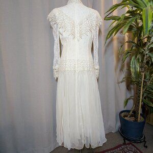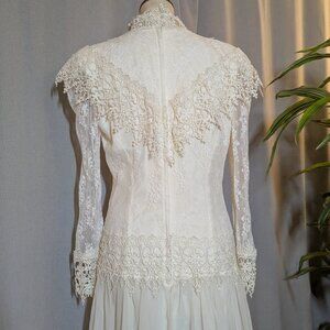 Ivory bridal gown with intricate lace bodice. Soft, flowing skirt. Ideal for a timeless wedding look.