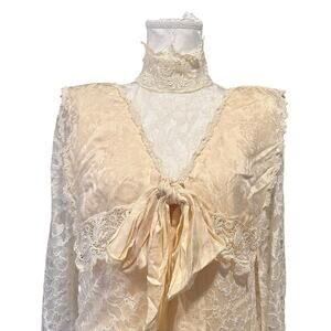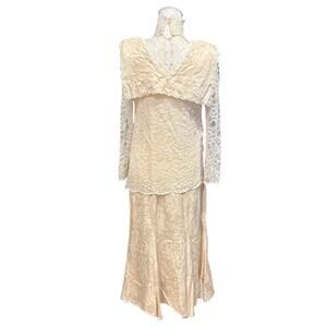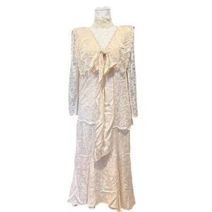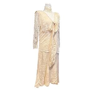 Vintage Jessica McClintock ivory silk lace dress in size 8. Features a romantic ruffle collar, asymmetrical neckline, and 3/4 lace sleeves. Shift silhouette offers timeless elegance with a soft, feminine touch. Perfect for bridal, formal, or vintage lovers.