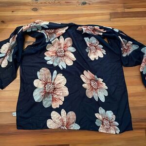 Navy blue, lightweight, sheer, pink floral print, open front, kimono, wrap, top by Jessica McClintock in one size. Sequin accents. Fabric is 100% polyester. Hand washable. Approximate measurements shown in photos. Loose fitting armholes. In very good pre-owned condition.