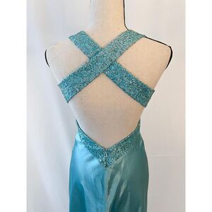 Jessica McClintock Aqua Blue Satin Sequined Gown – Size 3