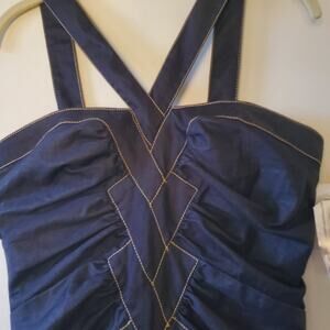 The Jessica McClintock Sheath Dress is a deep blue body-con dress with ruched stitching, perfect for formal occasions like weddings or parties. This sleeveless dress features a sweetheart neckline and a zip closure, made of polyester denim fabric. The dress is designed with a solid pattern, strappy sleeves, and a short length, ideal for a going out theme. With a size 10 fit and stretch features, this Y2K-inspired dress exudes elegance and style.