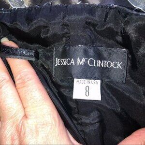 Exquisite formal dress by Jessica McClintock. Color is pewter. Lovely ribbon detail all over. Excellent condition probably only worn once. I believe this is from the 90’s. Size on tag is 8. There’s no way it would fit an 8 today which is why I listed as a small possibly extra small so PLEASE refer to measurements: armpit to armpit 15”, waist across the front 13.5”, length from under arm to hem 28”. Has zipper in the back. Also has soft boning in the bust to keep it up. This dress is stunning.