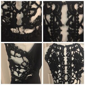 Heavily worn and needs repairs on the lace design fabric on back! Buttons are also loose and one has fallen off. However, I have the button. (See last photo with button in bag.) Zipper closure on back. See photo collage showing all areas where lace fabric is ripped. Measurements: Bust: 33” / Waist: 26” / Hip: 35” / Length: 51”. Perfect for Homecoming/Formal/Dance/Wedding.