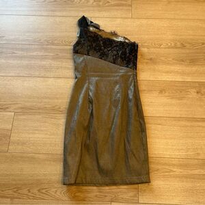 Jessica McClintock Vintage Black Lace Tan Metallic One Shoulder Cocktail Dress Size 4. Excellent used condition.