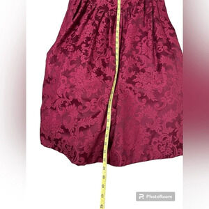 Maroon/burgundy silky satin like fabric with red embroidered baroque damask design throughout.