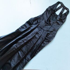 Features: Solid black satin halter neck fitted floor length formal dress with beaded neckline and open back. Separate full train attachment.