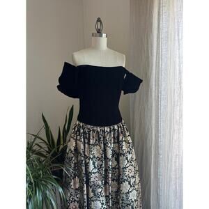Stunning 1980s Jessica McClintock evening gown with dramatic puff bow sleeves, a black velvet bodice, and a gathered brocade skirt in gold, blush, and ivory floral scroll. Fitted bodice and full midi-length skirt create a striking silhouette. Zips up the back. Timeless vintage glam.