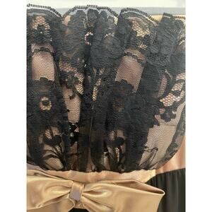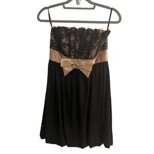 Black and Gold Strapless Dress, Lace at Chest, Gold Bow under bust line. The bottom hem of the dress is a bubble hem - see picture.