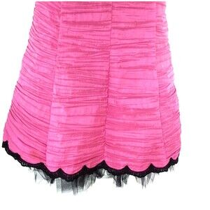 * DESCRIPTION WOMEN'S HOT PINK RUCHED SLEEVELESS DRESS. DRESS IS FITTED TO WAIST AND IS FLARED, LINED AND HAS BLACK TULLE PETTICOAT ON BOTTOM 6 INCHES. TOP OF DRESS IS BONED TO WAIST.