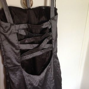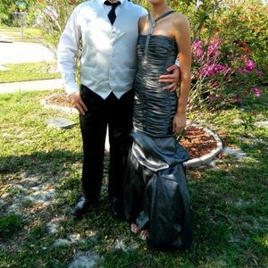 Beautiful Jessica McClintock floor length gown. It's metallic gray and has ruffling all the way down the front of the waist. The back is open with a few straps. The bottom of the dress is like a balloon/ mermaid hem. Top has gems that attach to straps. This dress was only worn twice and is in perfect condition.