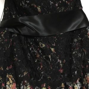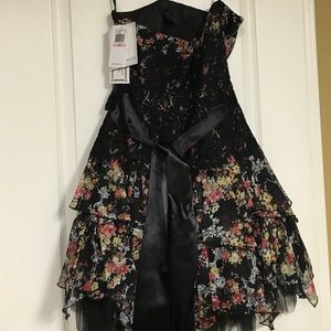 This short floral formal gown is adorable ! It has tool on the bottom, lace on the bodice, and a cute floral print. The perfect dress for a special occasion !