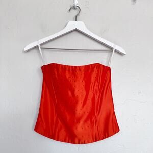 Orange strapless two piece gown by Jessica McClintock x Gunne Sax. From the Millennium 2000 collection. Vintage y2k prom dress. Missing one embellishment and has a couple of small spots of very minor discoloration. Hanger mark on skirt. Still in very good condition.