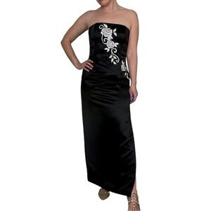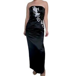 VTG 90’s Jessica McClintock x Gunne Sax Strapless Black Formal Dress with a Silver / White Rose embroidered detail.