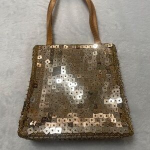Jessica Mcclintock Sequin Handbag Gold Tone with top handles. This is a small purse its 6 inches wide by 7 inches deep.