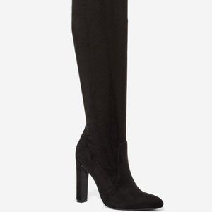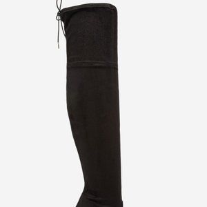 An over-the-knee boot featuring a block heel, almond toe, adjustable tie, and side zipper closure. Material: Vegan-Suede Calf Circumference: Reg: 16.5"; Wide Calf: 17.5" Fit: True to Size Color: Black Outside Heel Height: 4.0" Closure: Functional Inner Zipper Sizing: Measurements Based on Size 8 Shaft Height: 21.0"
