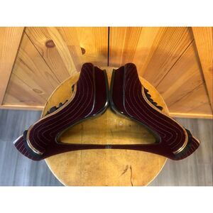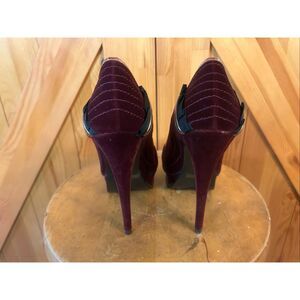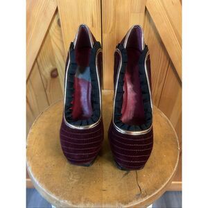 Jessica Paster Dark Red Velvet Platform Heels Gold Black Ruffle Womens Sz 8 5.5” heel 1.25” platform has a piece of inside lining missing from sticker removal see photos