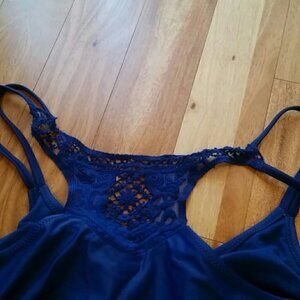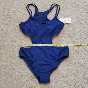 new with light defect.DEFECT on the one strap (crochet decoration) threads was fixed.PLEASE see pictures and understand condition what you buy. removable soft padded not included n.Color: Marine 82% Nylon, 18% Spandex Imported Hand Wash Solid one-piece swimsuit featuring split straps and crochet inset at back прSW