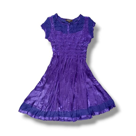 Gorgeous purple dress with a charming crinkle texture. The crinkle gives the bodice lots of stretch. Has semi sheer chiffon insets at neckline, sleeves, and hemline.