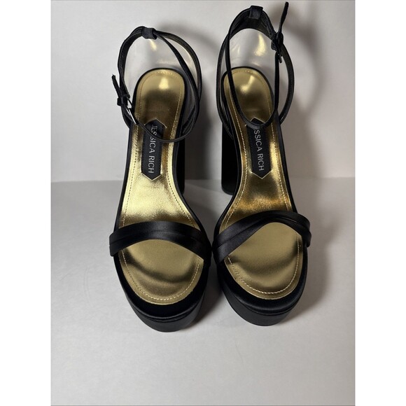 These Like-New Jessica Rich platform sandals in satin noir are an EU size 40 which is normally a US 9.5. They are a black satin heel with a clear heel back and have a strappy buckle closure. Gently worn once.