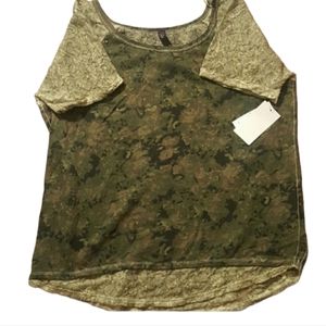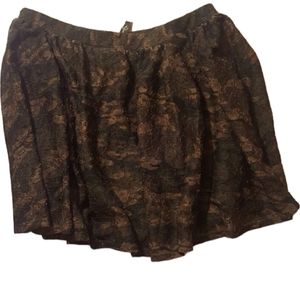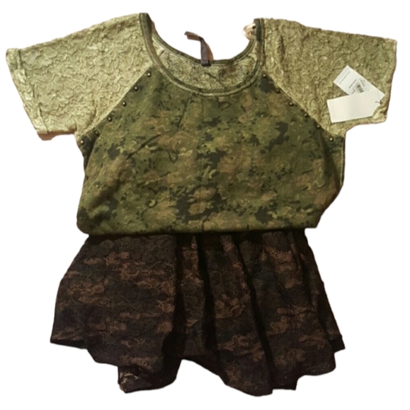 Camouflage green top trimmed in lace with gold studs black and brown camouflage lace skirt..top is L skirt ran small it is a XL?
