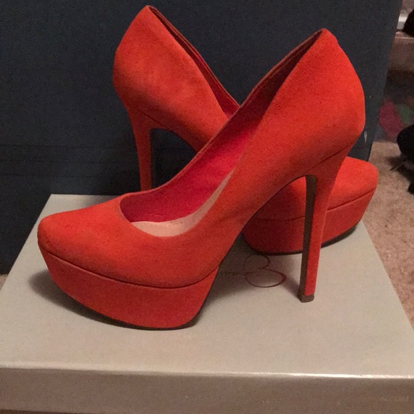 Real suede heels in good condition with small spots but can be cleaned. Color is “Spiced Coral”