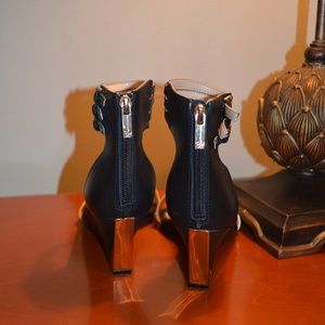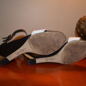 Lovely black and white Jessica Simpson shoes with stunning details. These low wedges have three straps with gold buckles at the ankle, as well as a gold panel detail on the back of the shoe. Lovely and comfortable, these shoes have been very gently worn and are in good condition