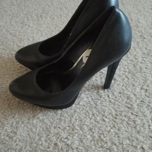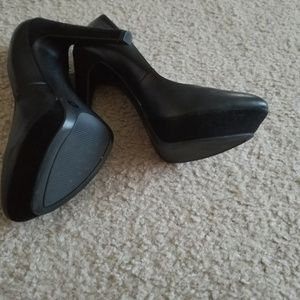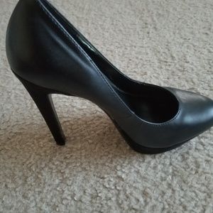 Sexy black high heels. The shoe has a beautiful suede detailing at the bottom. The platform makes the shoe very stable for walking, even though the heels are high. Worn once to a birthday dinner. Shoes are in excellent condition! Come from a smoke free and pet free home.