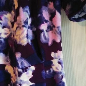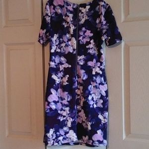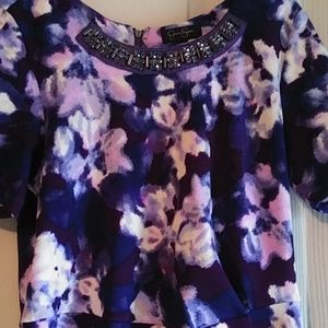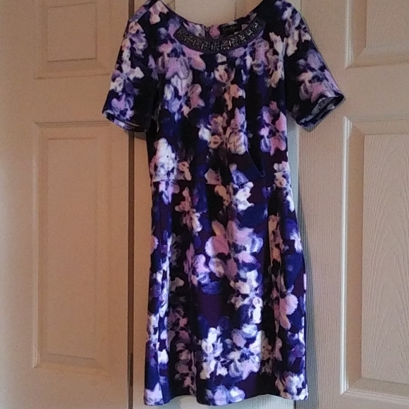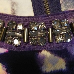 Lovely floral print in purples & blues. By Jessica Simpson. Body flattering Stunning sewn on rhinestone necklace. Small slit at hem.