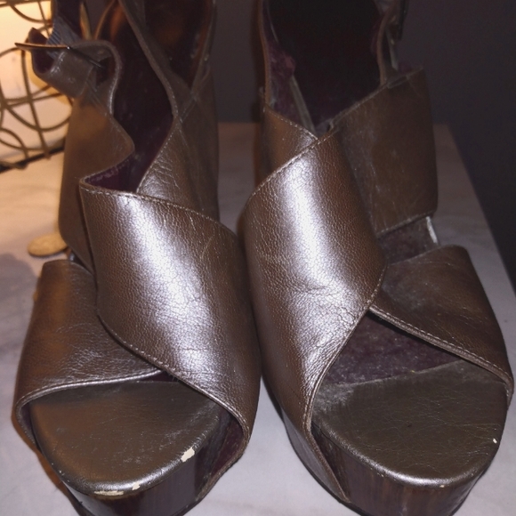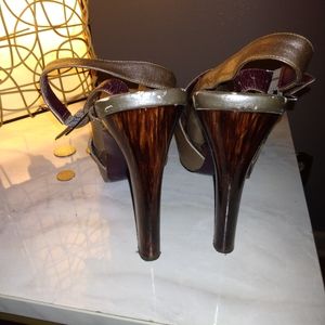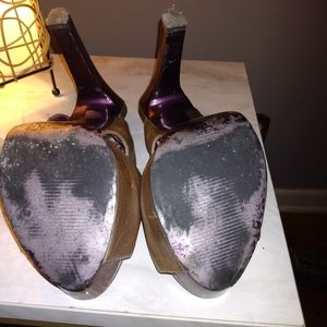 These are used but still in good shape. Love the metallic grey color that will go with any outfit. I would estimate this heel to be about 4 1/2 in height