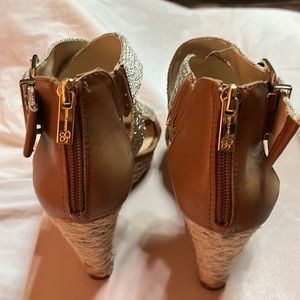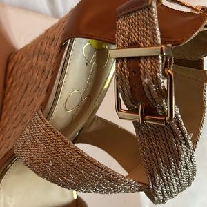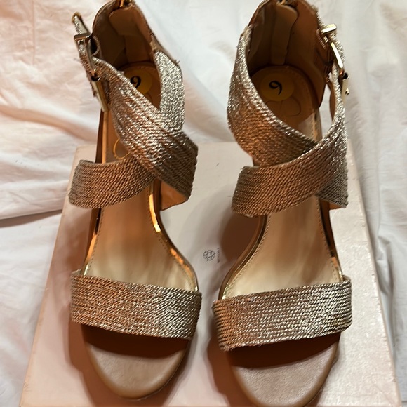 Woven platform gold lame crisscross sandal with zip back