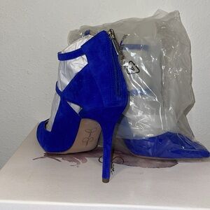 Put your flawless look on display with the Jessica Simpson™ Liviana pump! Suede upper material. Back zippered closure with dual buckled straps over instep. Pointed toe. Geometric cut-out details at sides. Lightly padded footbed.
