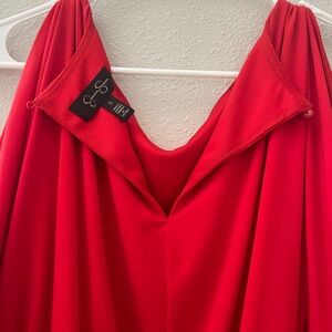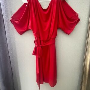 Stylish orange/red dress with cold shoulder design. Features a tie waist for a flattering fit.