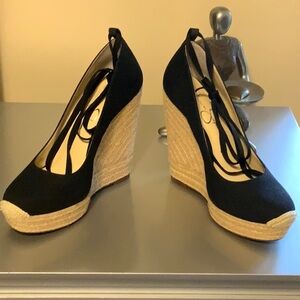 Stylish black wedges with tan espadrille sole. Elegant lace-up design. Perfect for any occasion.