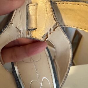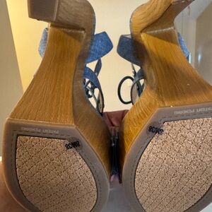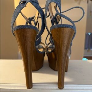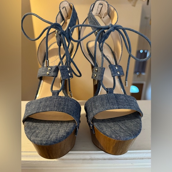 Stylish blue denim lace-up platform sandals. Features a wrap-around ankle tie and a wood-look platform for confident height. Some peeling pictured, which Im sure about, because I’ve never worn them.