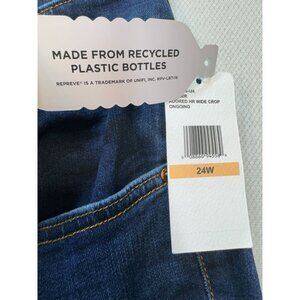 These high-rise wide crop jeans from Jessica Simpson provide a stylish and comfortable fit. Made with Repreve recycled materials, they are a sustainable choice, offering both fashion and environmental consciousness. The classic blue denim and button fly design make them versatile for various casual settings.