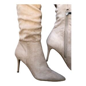 Look and feel sexy in these neutral beige, classic, slouchy, knee-high pointed toe 3" heel boots by Jessica Simpson. These are the perfect closet essential for the office, going out, clubbing, or wherever your adventures take you. Great beige color goes with everything from jeans to your favorite miniskirt or leather pants. The options are endless. SO cute!