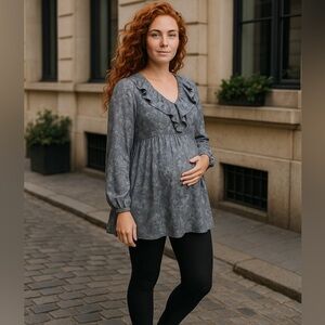 Jessica Simpson Babydoll Maternity Tunic Blouse Sheer Blue Gray Floral Ruffle XL