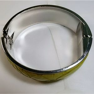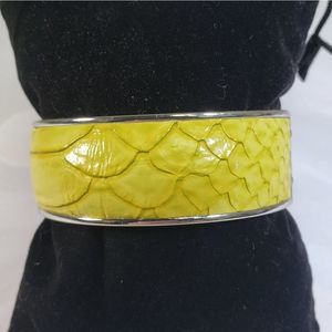 Hinged silver tone retro metal bangle with yellow faux snake skin leather inlay. Magnetic closure + Jessica Simpson logo engraved on the inside. Like new!