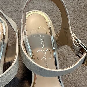 Chic and versatile sandals by Jessica Simpson. Features a stylish beige design and intricate heel pattern. Ideal for any occasion.