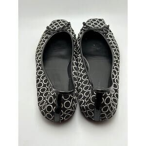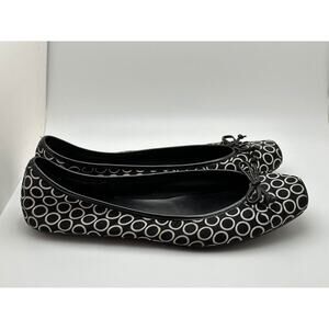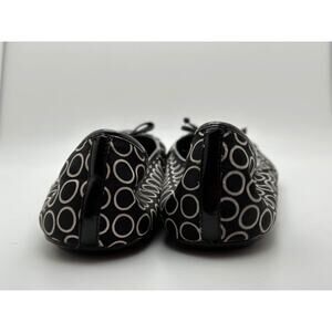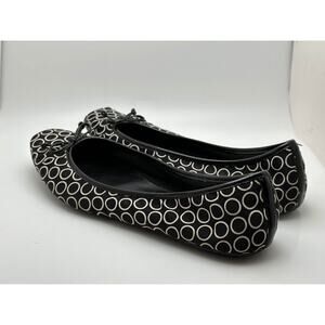 Good used condition-Please see photos. Comfortable black ballet flats with white circled dotted design. Tiny bow accent on the fronts and black stripe detail on the heels.