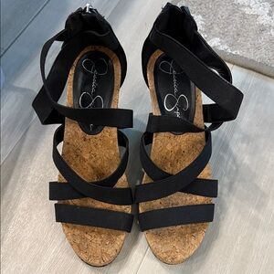 Elegant black sandals with cork footbed. Strappy design for a stylish look. Ideal for versatile wear.