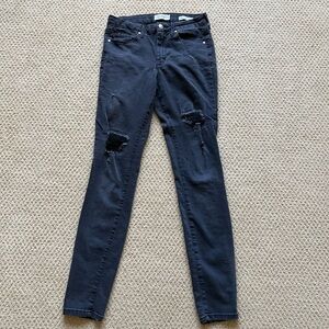 Description: dark grey black high rise distressed skinny Jean, some areas are patched distressed while other are just distressed