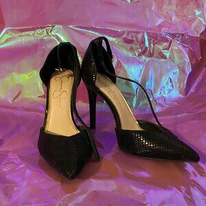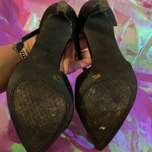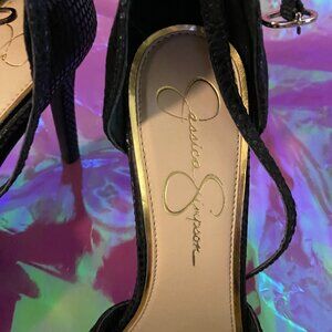 Jessica Simpson black heels, ankle strap, size 8m, run small.