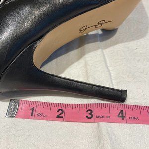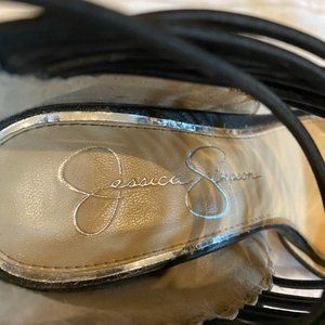Jessica Simpson black strappy faux leather heals, size 8M. In very nice, lightly used condition with only visible sign of wear and tear on ball of sole to tip of toe. Heal is approximately 4". Please see potos.