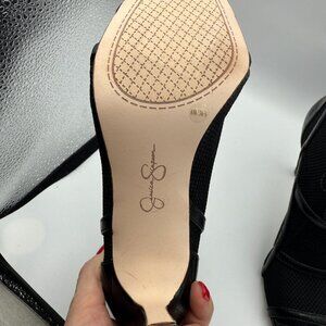Sleek, bold, and effortlessly stylish—these Jessica Simpson ankle booties feature a breathable black mesh design with faux leather trim for a modern, edgy vibe. The stiletto heel and peep-toe cut make them the perfect statement shoe for nights out or special events.