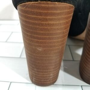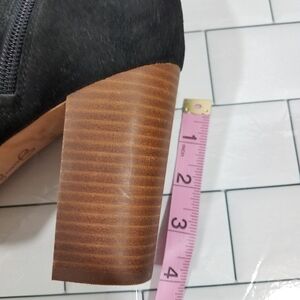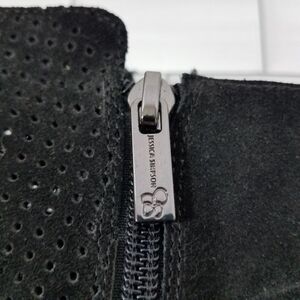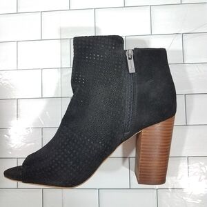One mark on back of heel. New without box, bottoms are slightly dirty from trying on. Black suede die cut booties, zippers on each side. See pics for measurements.